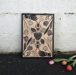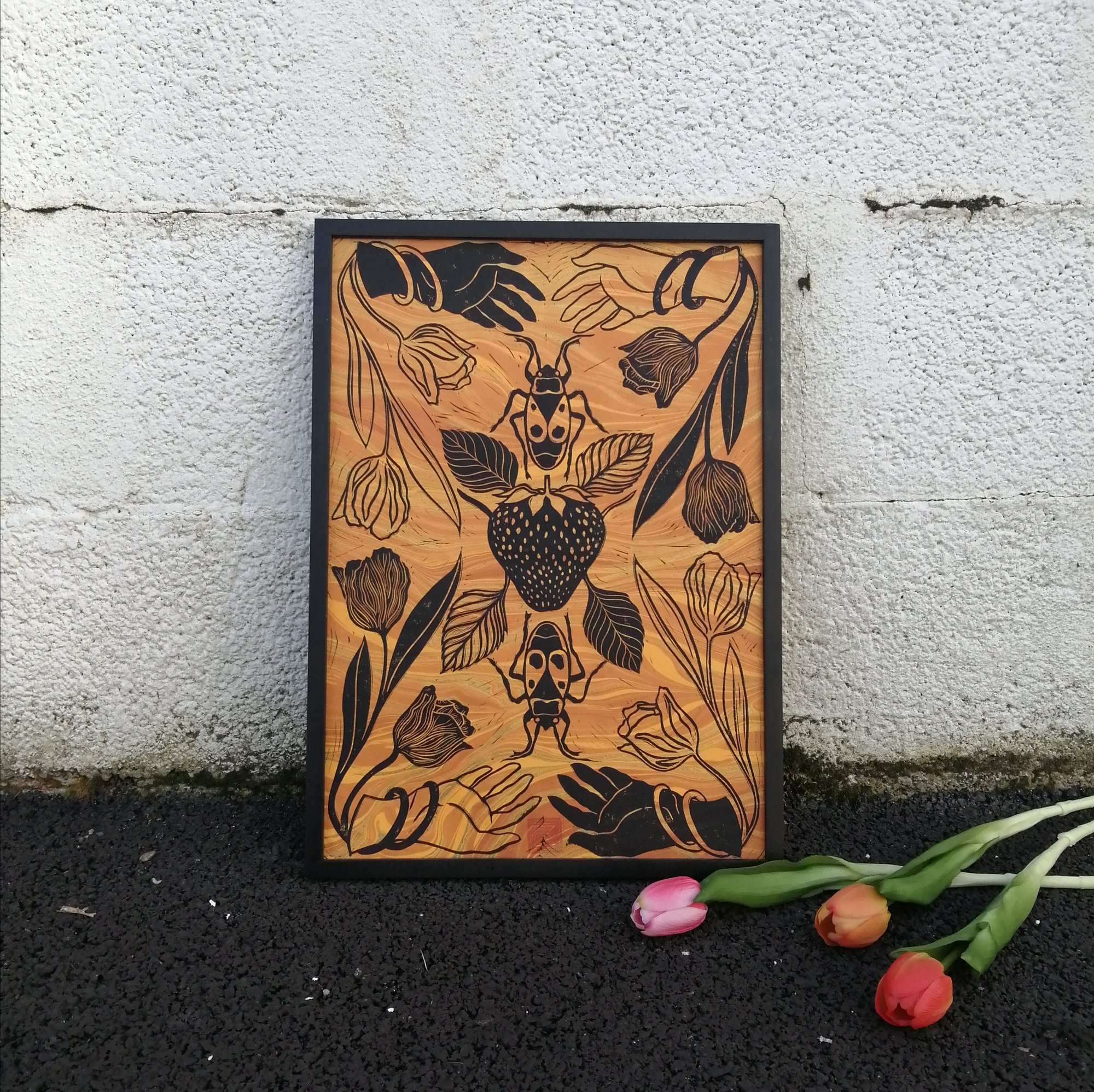 Linogravure format A3 imprimée sur papier Lokta marbré orange, Lokta beige, Lokta ocre et sur une ancienne carte beige.