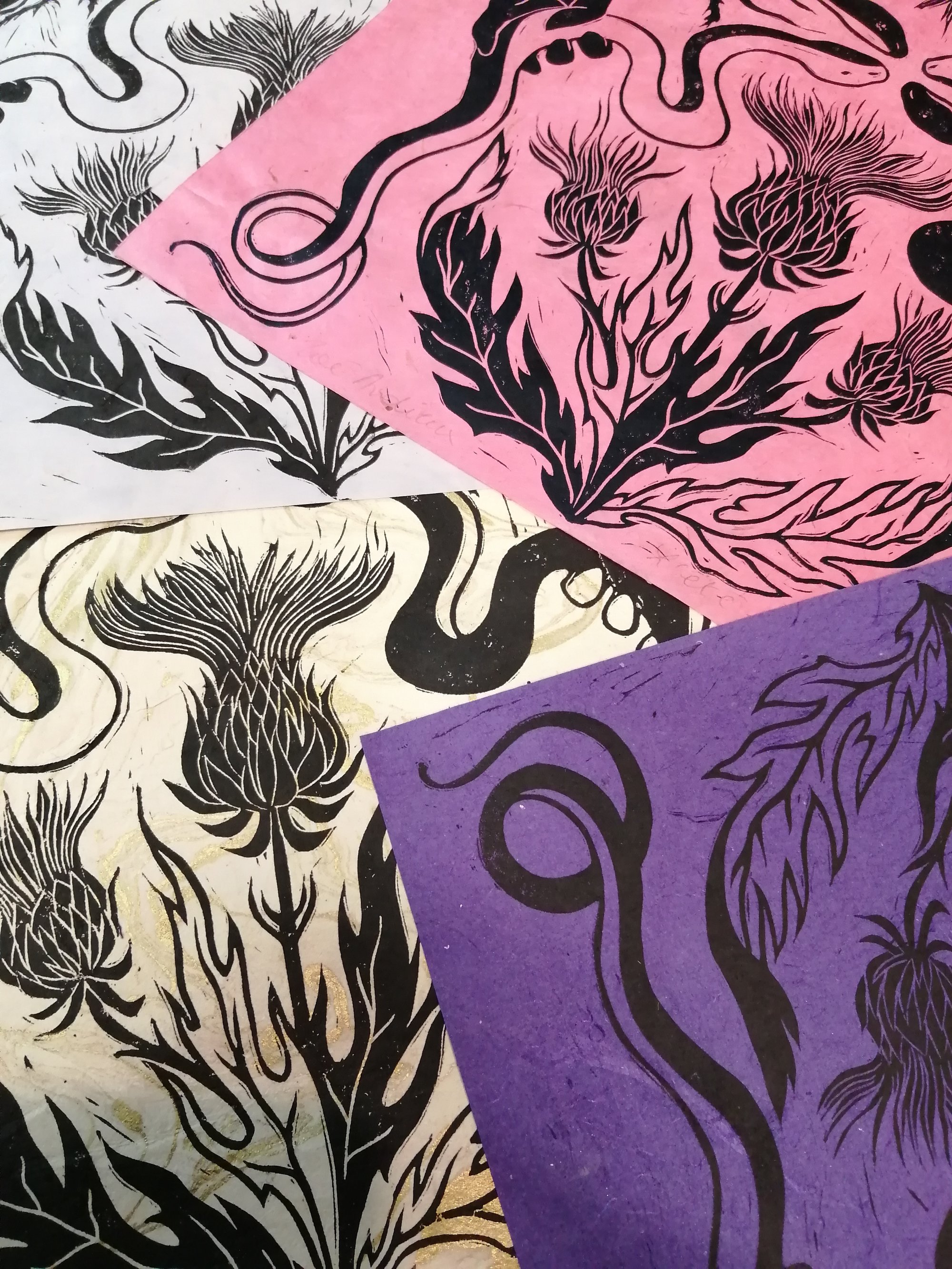 4 impressions différentes : sur papier marbré or et blanc, sur papier violet, papier rose bonbon ou papier lila.